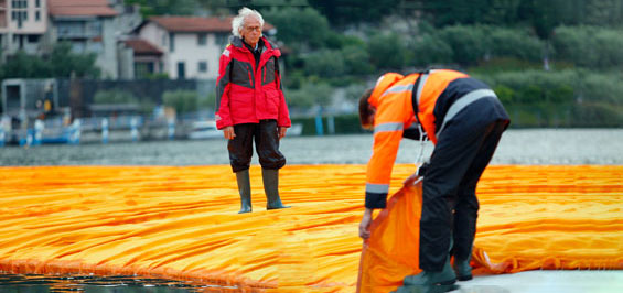 Anders nun in Italien, wo Christo bereits zu Beginn seines Werdegangs in den Sechziger Jahren, als die moderne Kunst in Italien ihren letzten großen Höhepunkt erreichte, gleich drei Projekte verwirklicht hat. 1968 verpackten Christo und Jeanne-Claude anlässlich des „Festival dei due mondi“ den Brunnen und den Turm von Spoleto, 1970 die Statuen von Viktor Emanuel und Leonardo da Vinci in Mailand, und 1974 die Aurelianische Mauer inklusive der Porta Pinciana in Rom. Jetzt, vierzig Jahre später, hat Christo für „The Floating Piers“ die markante gelbe Farbe von „The Gates“ 2005 aufgegriffen, nachdem er seit dem Tod seiner Frau im Jahr 2009 in New York kein Großprojekt mehr realisiert hatte. Wie eine persönliche Huldigung oder mit Blick auf die fernöstliche Facette der gelb-orangenen Farbigkeit, auf die Christos Wahl für Italien fiel, wie eine westlich-ephimere Antwort auf das indische Taj Mahal wirkt die Fortsetzung des nunmehr allein schaffenden Künstlers. Die „Piers“ fluteten getreu aller mit Jeanne-Claude in Gemeinschaftsarbeit festgelegten Projektprinzipien nur für etwa zwei Wochen wie ein posthumes Monument der Liebe den See, den, so erzählt man sich in der Gegend, Jeanne-Claude, die u.a. in der Schweizer Berglandschaft aufgewachsen ist, als ihre Familie 1948-51 vorübergehend nach Bern zog, sehr gefallen haben soll. In Erinnerung an die über fünfzigjährige gemeinsame Zeit, in der das Ehepaar zusammen lebte, arbeitete und auf schwankenden Planken durch das Leben geschifft sein mag, erklärt Christo in einem Interview mit lebensbejahender Fröhlichkeit: „In unserem Projekt geht es nur um Freude und Schönheit“. Dieses sei, zitiert Christo seine Frau, absolut ohne Nutzen, eigentlich „überflüssig“ und vermittle keine Botschaft, außer der, dass ein Kunstwerk erst dann existiere, wenn es gesehen werde. Für junge Künstler bedeute dies, dass sie eben kein „Inseldasein“ führen dürften, um in einer „splendid isolation“ oder dem Elfenbeinturm vor sich hin zu arbeiten, sondern dass sie sich mit der Welt auseinandersetzen müssten – und sei es eben in Jahrzehnte langen Kriegen mit Bürokraten. Ein Krieg freilich, den insbesondere Jeanne-Claude führte. Ein Kunstwerk, endet Christo denn auch vor der Kamera, solle vor allem eines: „Diese irrationale und absolut unerklärliche Freiheit, die wir haben“ feiern. Ihm gehe es allein ums Gefühl: „Man muss es sehen, fühlen, bewegen – mit allen Sinnen!“. Jeanne-Claude sei immer um ihn herum gewesen, beteuert er, als das Finale der „Floating Piers“ am 13. Juni begann, dem gemeinsamen Geburtstag von Christo und Jeanne-Claude. Die rund 600 Arbeiter montierten genau an diesem symbolträchtigen Datum das Kunstwerk innerhalb weniger Tage und pünktlich zum Veranstaltungsbeginn.